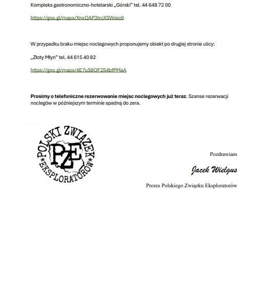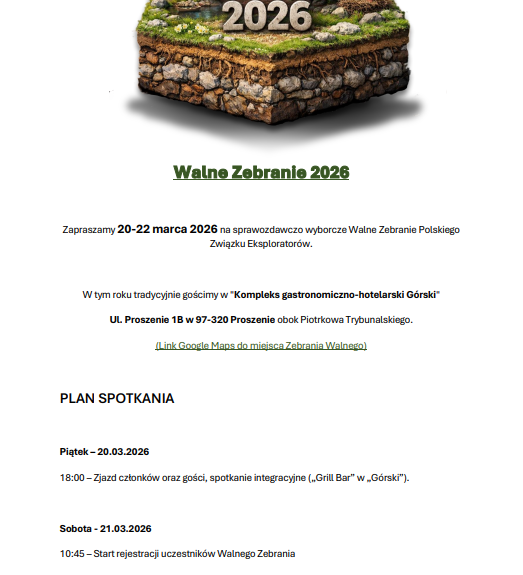 Zapraszamy Was serdecznie do udziału w Walnym zebraniu Członków Polskiego Związku Eksploratorów, które odbędzie się w dniu 21.03.2026 r. (sobota) w Kompleksie Gastronomiczno-Hotelarskim Górski (Proszenie 1B, 97-320 Wolbórz).